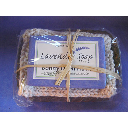 Beautiful handmade pottery soap dish with 1.5-oz. soap and washcloth, gift ready wrapped in cellophane and tied with raffia and a gift tag.