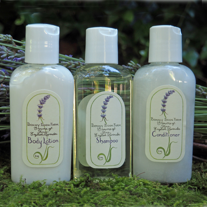 Our lavender travel set with 2-oz lotion, shampoo, and conditioner. Wrapped in a cello bag, tied in raffia with BDF gift tag. Great for quick gift ideas.